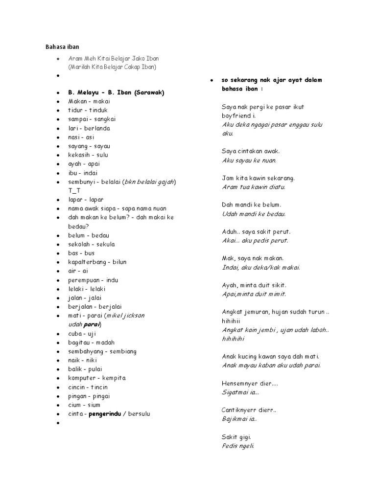 See more of bahasa iban on facebook. Bahasa iban atau bahasa dayak iban adalah bahasa yang digunakan etnik dayak dari suku iban yang tinggal di pulau kalimantan. Selain daripada memudahkan pergaulan, ianya secara tidak langsung merapatkan hubungan. 12 cara romantis ungkapkan cinta dalam bahasa arab. Doc pansik litaricha iban pengap iban pengap literature research nicholasempusut anggit academia edu.